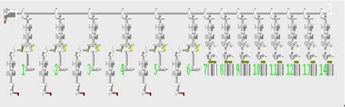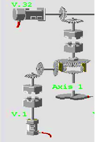由一臺虛擬伺服電機經一虛擬主軸通過齒輪、離合器、變速機差速齒輪/變速機,驅動滾筒或凸輪 。滾筒代表復合輥或壓合/牽輥或輸送輥, 凸輪代表切刀輥。30個離合器由一個位軟元件控制,所以當這臺虛擬伺服電機以某一轉速啟動,即通過虛擬主軸將脈沖數和脈沖頻率傳遞給切刀輥、復合輥、壓合/牽輥、輸送輥使它們按設計好的速度同步運行。(由于版面限制只復制了14軸伺服)