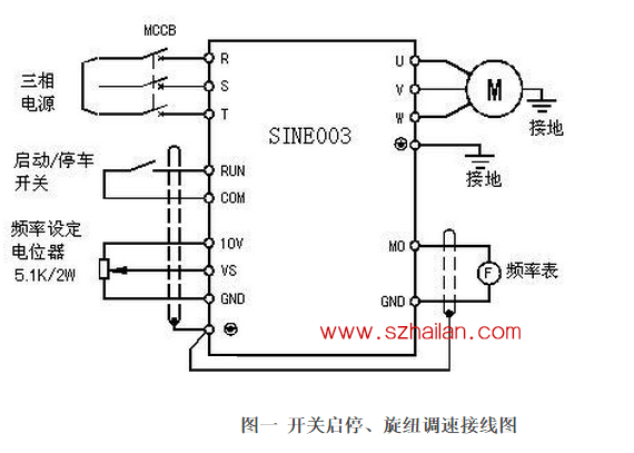 關掉電源,電源指示燈熄滅后,再連接電機、起停開關、電位器、頻率表(0~10V電壓表頭)等,變頻器和電動機接地端子可靠接地,并仔細檢查。