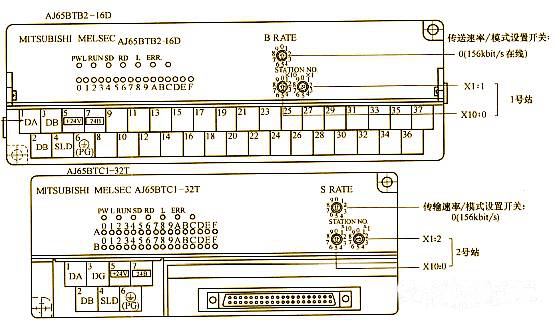 (2)遠程I/0站的設置為,AJ65BTB2-16D模塊的站號設置開關:01 AJ65BTC1-32T模塊的站號設置開關:02 ,他們的傳輸速度/模式設置開關都設置為:0 如下圖所示: