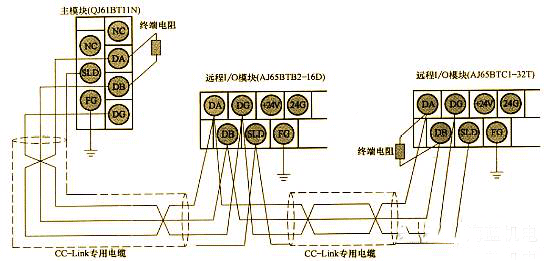 (1)CC-Link專用電纜連接。用CC-Link專用電纜連接模塊,兩端加終端電機,如下圖所示。在連接前一定要斷開電源。