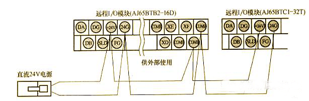 (2)直流24V線路連接。遠程I/O站(內部和外部I/O)的直流24V電源線的連接如下圖所示。連接前一定要斷開電源,注意正負極性。