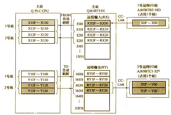 (1)數(shù)據(jù)的刷新。Q CPU主站的緩沖存儲器的遠程I/O站的刷新關系(RX/RY)。如下圖所示:
