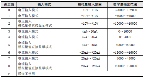 請根據連接的模擬量發(fā)生器的規(guī)格,設定與之相符的各通道的輸入模式(BFM #0)。用16進制數(shù)設定輸入模式。請在使用通道的相應位中,選擇下表的輸入模式,進行設定。