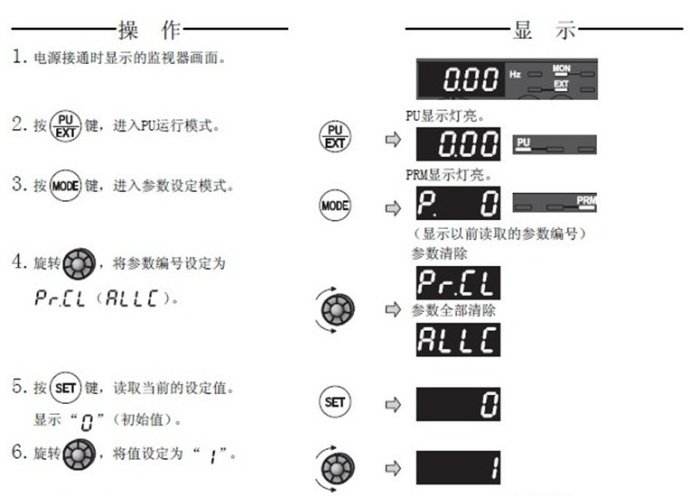 第六步:旋轉"調整旋鈕"把設置值為“0”(當三菱變頻器參數Pr.77值=1時,無法恢復出廠)