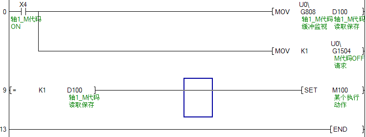 下面是一個把“ Md.25 有效M代碼”讀入PLC CPU 數據寄存器(D110)的順