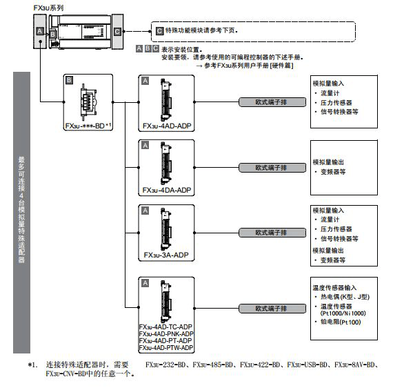 據(jù)小編了解,三菱FX3U系列PLC最多可以連接4臺三菱PLC模擬量特殊適配器,最多可以連接8臺三菱PLC特殊功能模塊。