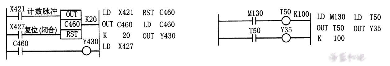 計數(shù)器輸出觸頭C460 接通,使輸出繼電器 Y430 得電。X427 閉合時,C460 復位并斷開